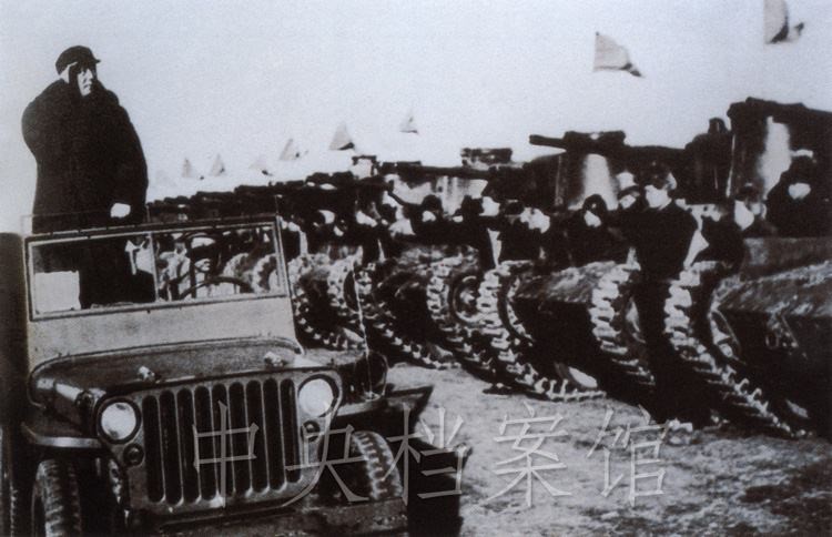 紀錄片:(群眾呼聲)中國人民萬歲?。o錄片解說)檢閱開始了。東北野戰軍參謀長劉亞樓將軍,向毛主席報告受檢閱的部隊全部到齊。坦克塔上飄揚著紅旗,坦克手精神百倍,向著自己的領袖敬禮。